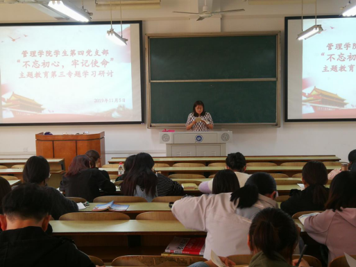 2019年11月5日下午16:00-17:00,管理学院学生第四支部全体党员在支部书记周艺的带领下,在新校区D403开展了“不忘初心、牢记使命”主题教育第三阶段的集中学习。