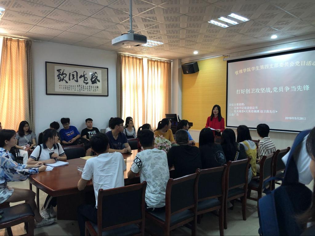 2019年5月28日上午十点,管理学院学生第四党支部进行了创卫宣讲党日活动。书记罗荃带领党员同志学习了《湘潭市创建国家卫生城市工作方案》、《打好创卫攻坚战,党员争当急先锋倡议书》、《文明再出发,创卫在路上》。同志们一起收看了《大美看湘潭·创卫我先行》湘潭市创建国家卫生城市公益宣传片,宣传片画面震撼,美好生活靠我们创造,创卫目标靠大家实现,让我们携手共创幸福健康湘潭。学习之后,党员同志们积极发言,争取为湘潭市创建国家卫生城市作贡献。
