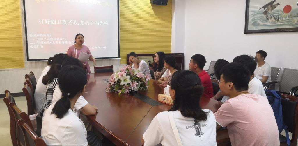 会上,支部书记单艳艳同志带领学生第三支部全体党员观看了“大美看湘潭,创卫我先行”的短视频,学习了湘潭市创建国家卫生城市工作方案,了解工作的指导思想和工作目标以及工作重点,并宣读了“打好创卫攻坚战,党员争当急先锋的倡议书。