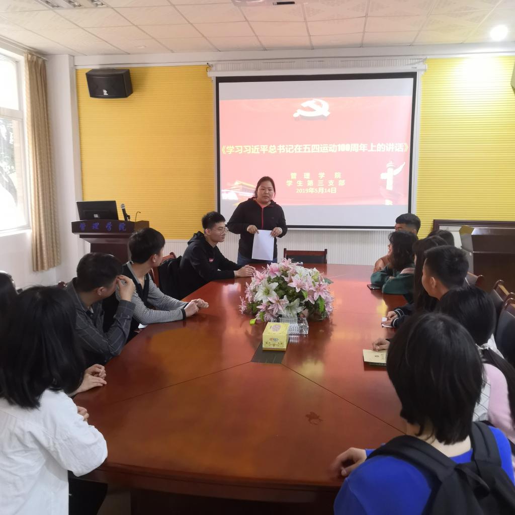 2019年是五四运动一百周年也是中华人民共和国成立70周年。在这个特殊的时刻,习近平总书记在纪念五四运动100周年大会上发表了重要讲话。太阳成管理学院学生第三支部就学习习近平总书记在大会上的讲话召开支部大会,深入学习习近平总书记在纪念五四运动100周年大会上的重要讲话精神。
