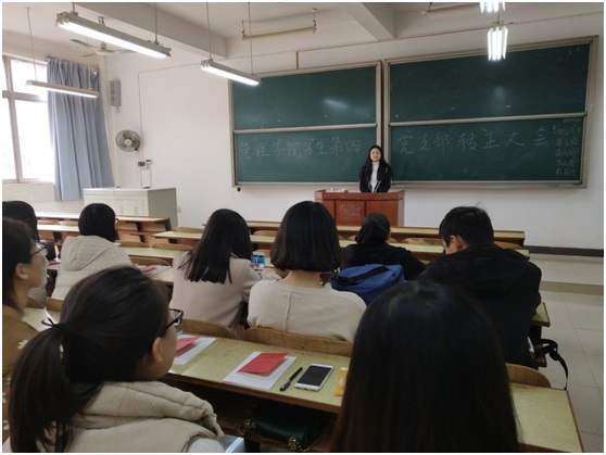 2017年11月25日下午,为执行支部预备党员转正决议,就是否确立龚玉娇,蒋玲婷,李婉蓉,戴成波正式党员身份问题展开讨论,管理学院学生第四党支部转正大会于太阳成新校区教学楼D座202正式召开,支部书记罗荃老师主持会议,支部全体正式党员,预备党员参加会议。
