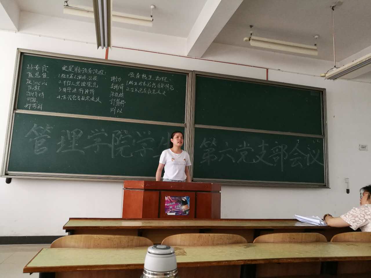 2017年5月22日13点,管理学院学生第六党支部支部大会在新校区d302举行,参加本次会议的有管理学院学生党支部书记周艺老师,管理学院学生第六党支部组织委员张欢欢、宣传委员王鹤凯,以及管理学院学生第六党支部的全体正式党员、预备党员及本次新发展对象。本次会议的的主持人是王鹤凯,记录人是候补支委陈星。