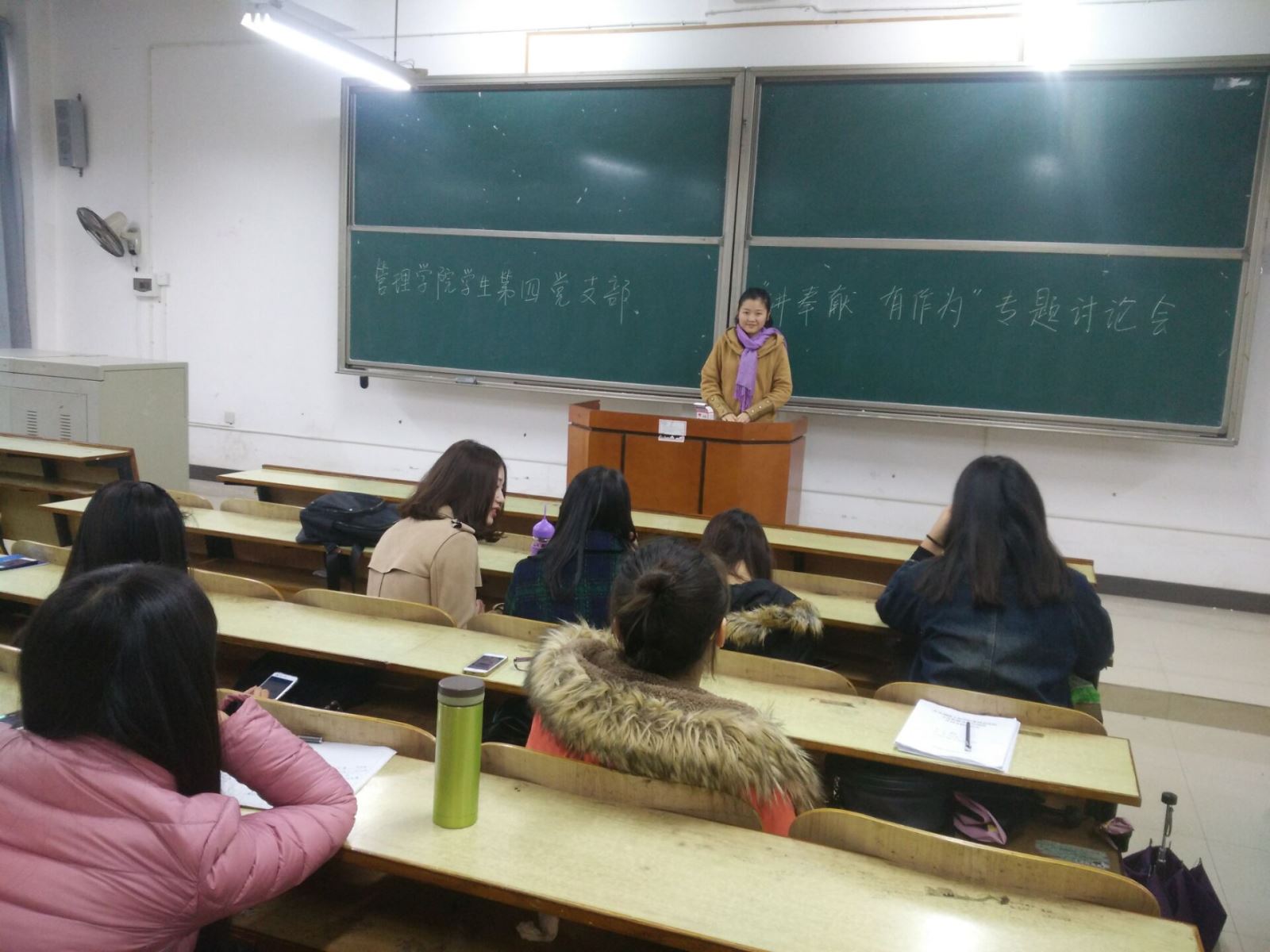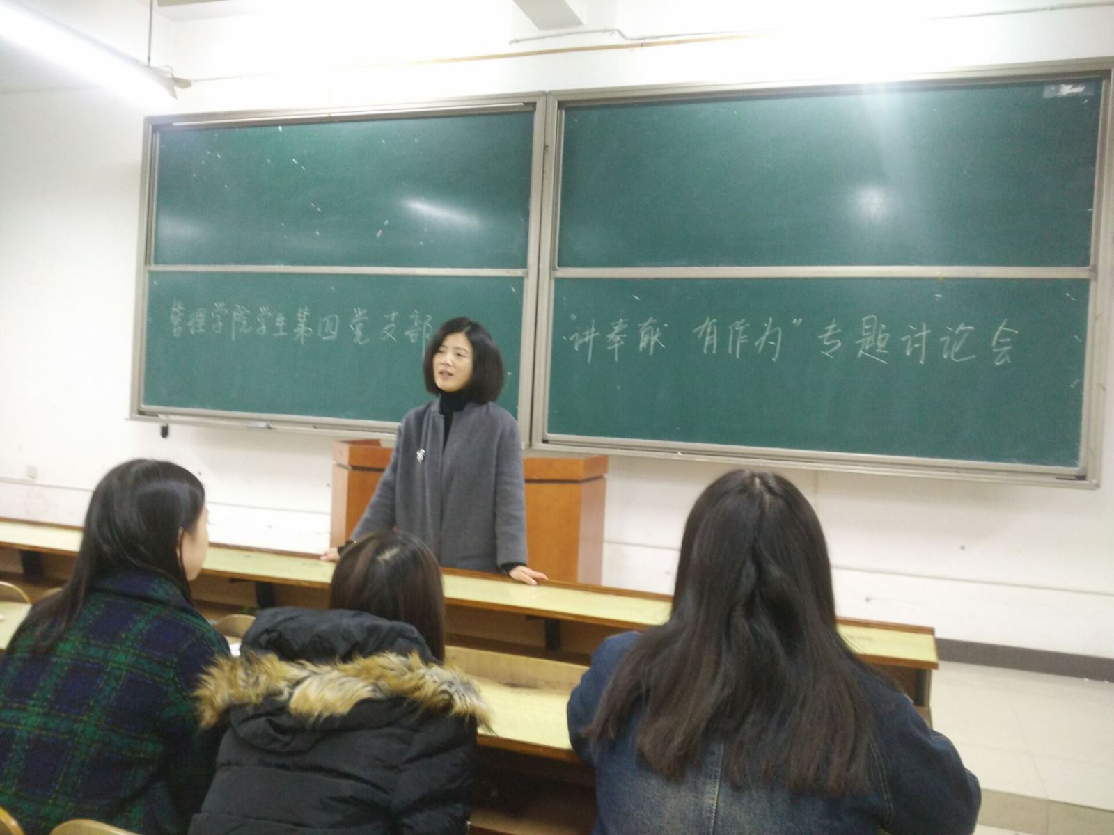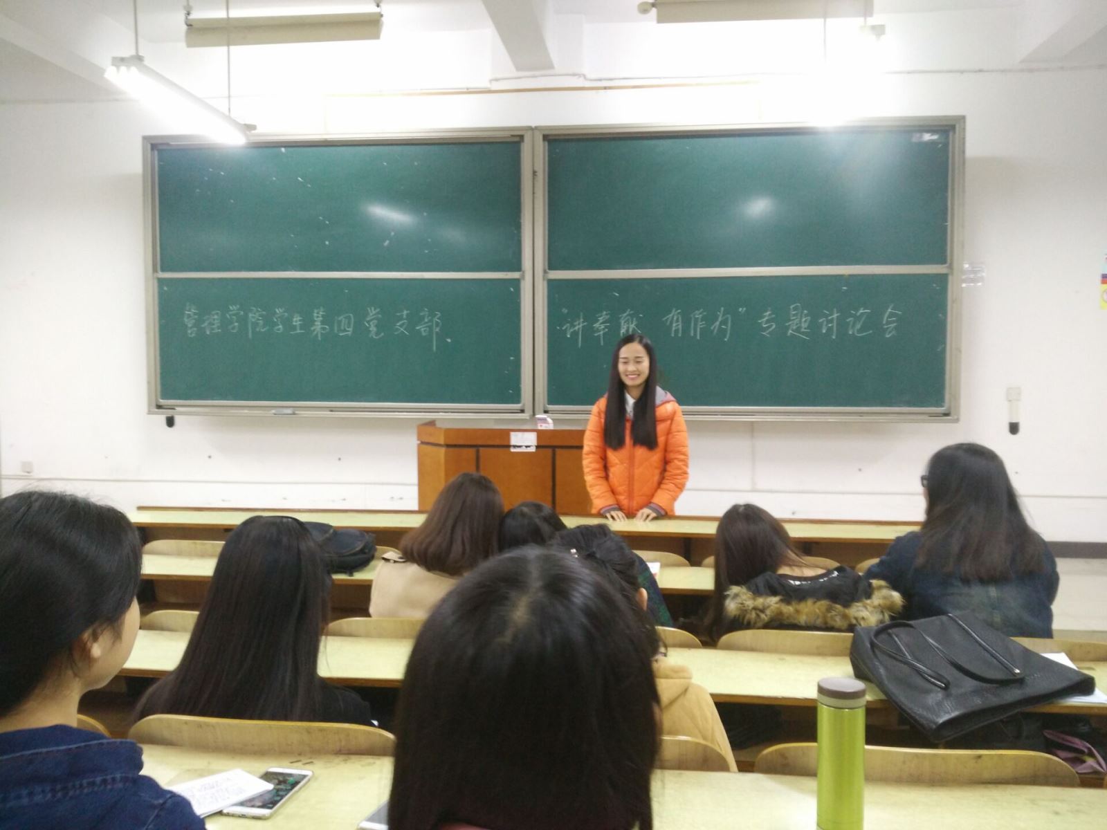 2016年11月9日下午15:00管理学院学生第四党支部在教学楼D座403教室开展了“讲奉献,有作为”的专题讨论会。会议由支部书记罗荃老师主持,会议围绕着“四讲四有”中的“讲奉献,有作为”这一主题而展开,罗老师首先根据自身近20载的教学经历告诉我们的学生党员,“讲奉献”是作为一名党员,一名人民教师必备的品质。作为我们的人民教师,在培育祖国人才这件事情上,讲奉献是必须的。与此同时,作为八千万党员中光荣的一员,讲奉献精神也是必须的。但是,我们的人民教师还不够有作为,在自己的岗位上还没有发挥最大的价值,这也就告诉我们的学生党员,将来进去社会,要找好定位,在自己的职业规划中有所作为,发挥社会价值。我们的大四学姐俞晓静学姐对此深有感悟,作为一名大四的学姐,即将毕业,在找工作的过程当中,我愈发地意识到学会自我定位的重要性,只有找对了工作,才能在工作上有所作为,发挥自己的社会价值。与此同时,在注意自身道德修养基础上,做些力所能及之事的同时带动更多的人投身奉献中,培养自身的奉献精神。最后,“讲奉献,有作为”在大家热烈的讨论氛围中圆满结束。