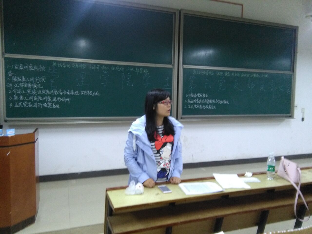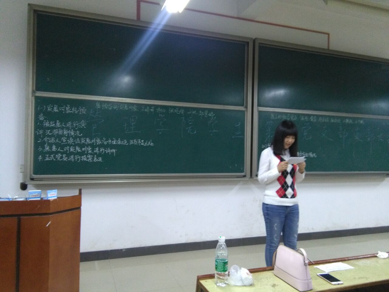 在讨论预备党员转正式党员和发展对象转预备党员的问题后,支部书记周艺老师进行了发言,她强调了支部大会的纪律问题,对部分大四学生党员无故不参加支部大会的情况进行了批评,之后带领大家重新学习了部分党章,希望在座的各位党员和预备党员在“两学一做”的活动中能发挥带头作用,在各方面带动并影响正在入党的同学,做合格党员。做到四讲四有,即讲政治、有信念,讲规矩、有纪律,讲道德、有品行,讲奉献、有作为。