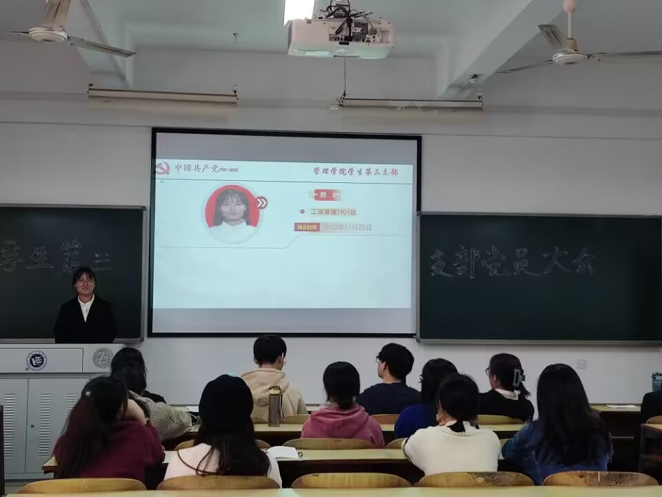 为进一步扩充党员队伍,增添新生力量。2022年11月25日中午12:30,管理学院学生第三支部委员会在新校区教学楼C栋202召开预备党员转正大会,讨论舒叶等7名预备党员的转正问题。会议由支部书记陈祎婷同志主持,支部共14名正式党员、22名预备党员参加会议。