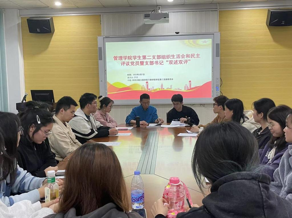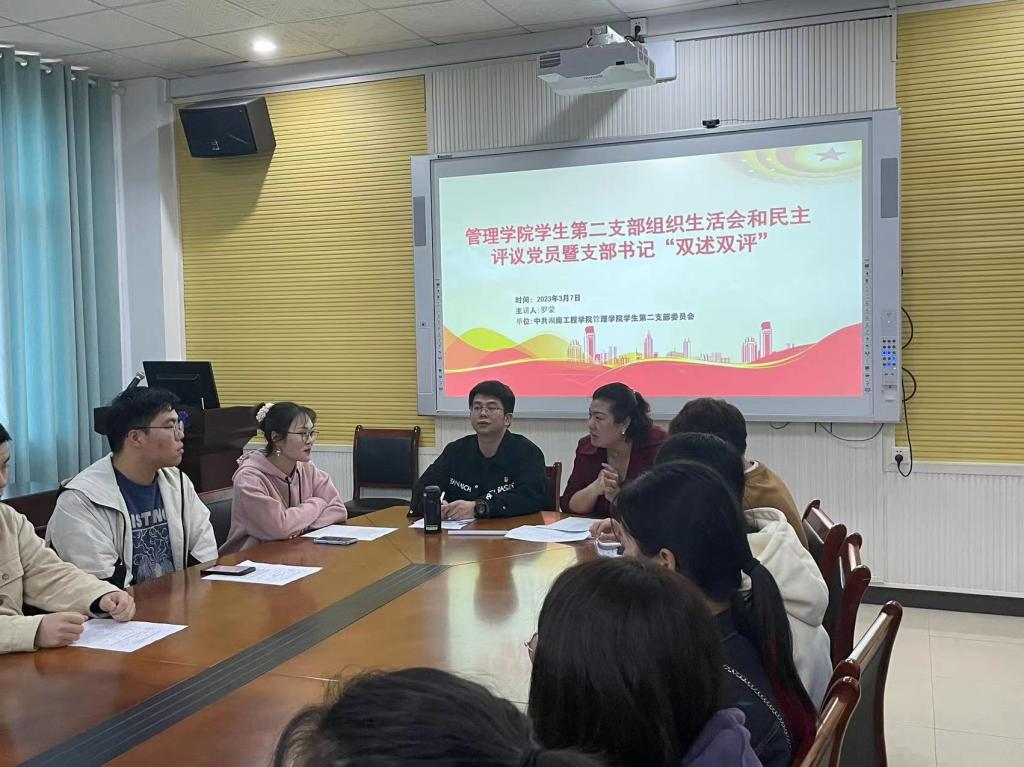 为提高支部全体党员党性修养,增强党员政治素养,管理学院学生第二党支部于2023年3月7日中午12:30在F104召开组织生活会和民主评议会暨支部书记“双述双评”。会议由支部书记罗蒙主持,管理学院副书记谭超进行点评,支部副书记包海燕与支部全体党员及预备党员参与了本次会议。