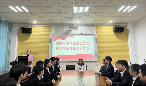 为进一步加强基层党组织建设,落实党支部发展党员工作计划,加强和培养党的后备力量。2023年11月27日,管理学院学生第三支部委员会在F104召开预备党员接收大会,对杨泽农等9名发展对象能否吸收为预备党员事宜进行讨论和表决。会议由支部书记陈祎婷主持,支部10名正式党员,5名预备党员全体参加会议。