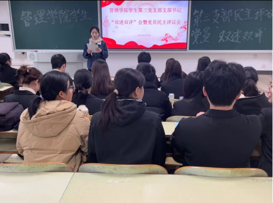为进一步加强基层党组织队伍建设、提升基层党建工作水平,增强党员的组织、纪律观念,提升党支部凝聚力和战斗力。按照上级党委的统一安排部署,3月4日中午,管理学院学生第三支部委员会在A座308召开2023年度双述双评会暨民主评议党员大会。会议由支部书记彭小玲主持,支部24名党员参加会议。