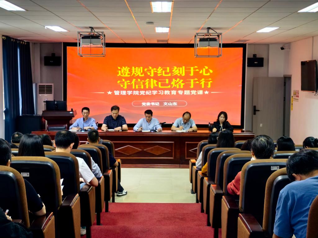 为了深入开展党纪学习教育,切实推动管理学院党纪学习教育走深走实,5月21日下午,管理学院党委书记文山东以《遵规守纪刻于心 守信律己烙于行》为题讲授了党纪学习教育专题党课。