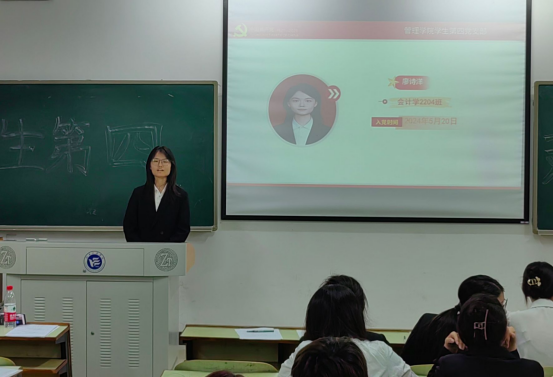 新预备党员代表廖诗洋上台发言,她讲到:“党的先进性,既体现在党的指导思想、宗旨、纲领、组织原则、党的纪律等方面,又体现在党员的理想信念、思想观念、道德品格以及学习、工作、生活等方面。共产党员要努力加强自己的党性修养,是做合格党员的根本条件,是终生的必修课程。”