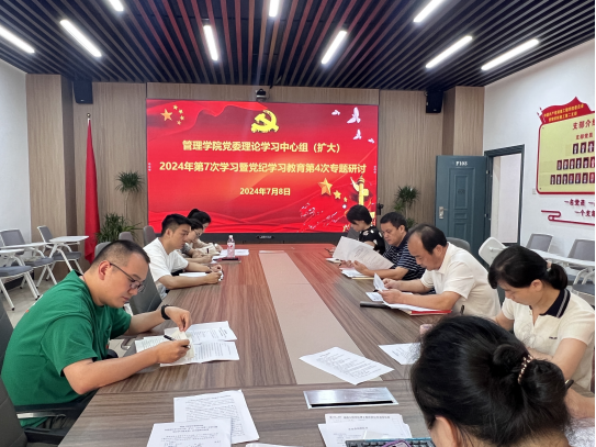 7月8日上午,管理学院党委理论学习中心组(扩大)在F103会议室举行2024年第七次学习暨党纪学习教育第4次专题研讨。学院党委书记文山东主持学习,学院党委理论学习中心组成员、各支部书记参加学习。