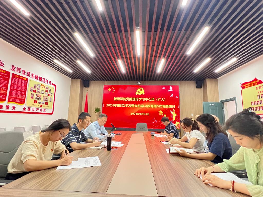 2024年9月23日,管理学院党委理论学习中心组(扩大)在F103会议室举行2024年第9次学习暨党纪学习教育第5次专题研讨。学院党委副书记谭超主持学习,学院党委理论学习中心组成员、各支部书记参加学习。