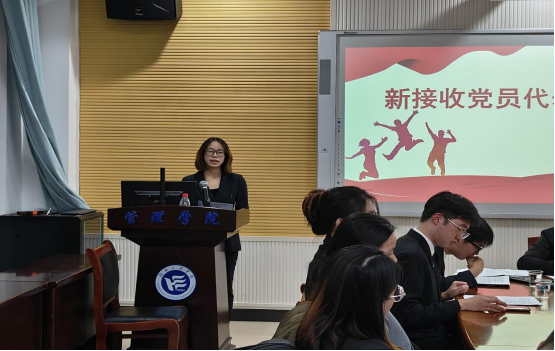 新接收党员代表王艺璐上台发言,她讲到“加强党性修养是成为合格党员的关键与终身课题。今后,我会在思想上坚守理想信念,在行动上践行党的宗旨。在学习中勤奋钻研,在工作里担当尽责,在生活中自律自省,努力提升自我,为党徽增光,为党旗添彩,不负党的培养与期望。”