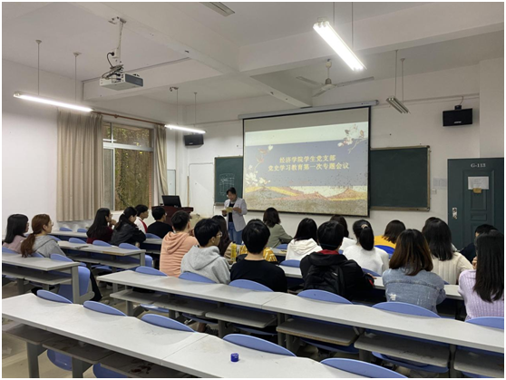 经济学院学生党支部书记李军花首先就党史学习的重要性做出了说明,同时对开展好党史学习教育提出要求:一要把党史作为最好的“教科书”,用党的创新理论武装头脑。坚持带着信念学,不断提高政治判断力、政治领悟力、政治执行力;坚持带着问题学,努力发现并解决学习生活中遇到的问题;坚持带着责任学,把学习成果转化为立足新发展阶段、贯彻新发展理念、服务构建新发展格局的本领。二要把党史作为最好的“清醒剂”,力戒形式主义。坚持在政治上深化认识,举一反三、引以为鉴,切实在思想深处受警醒、明底线,知敬畏、存戒惧;坚持在行动上持续发力,坚定不移“学党史、抓作风、正学风”。三要把党史作为最好的“营养剂”,在引领联系服务同学的过程中奋力前行,坚持围绕中心服务大局;接着由学生党员易佳慧导读学习习近平《论中国共产党历史》“知史爱党、知史爱国”等篇目,党员同志在专题学习本上认真做好学习笔记。