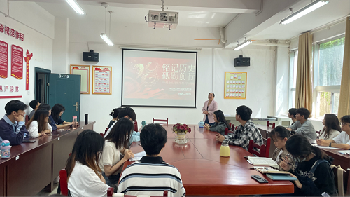 2023年9月26日下午,经济学院学生党支部在G115召开全体党员大会,学生支部书记李军花同志讲授“铭记历史,砥砺前行”主题党课,全体学生党员参加学习。