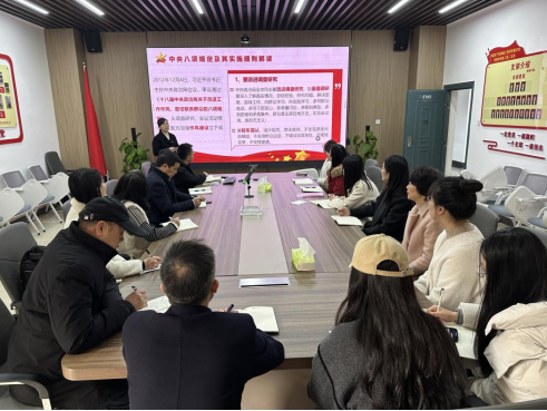 会上,支部书记刘喜梅从中央八项规定提出的时代背景出发,浅入深出地解读了规定的核心内容和精神实质。她强调,党的十八大以来,以习近平同志为核心的党中央将作风建设摆在更加突出位置,制定中央八项规定,涉及改进调查研究、精简会议活动、精简文件简报、规范出访活动、改进警卫工作、改进新闻报道、厉行勤俭节约等内容,为我们在新形势下党的作风建设抓什么、怎么抓提供了根本遵循。其精神实质在于厉行勤俭、坚决反对奢侈浪费和奢靡之风,要求党员干部廉洁从政、秉持务实的工作作风。
