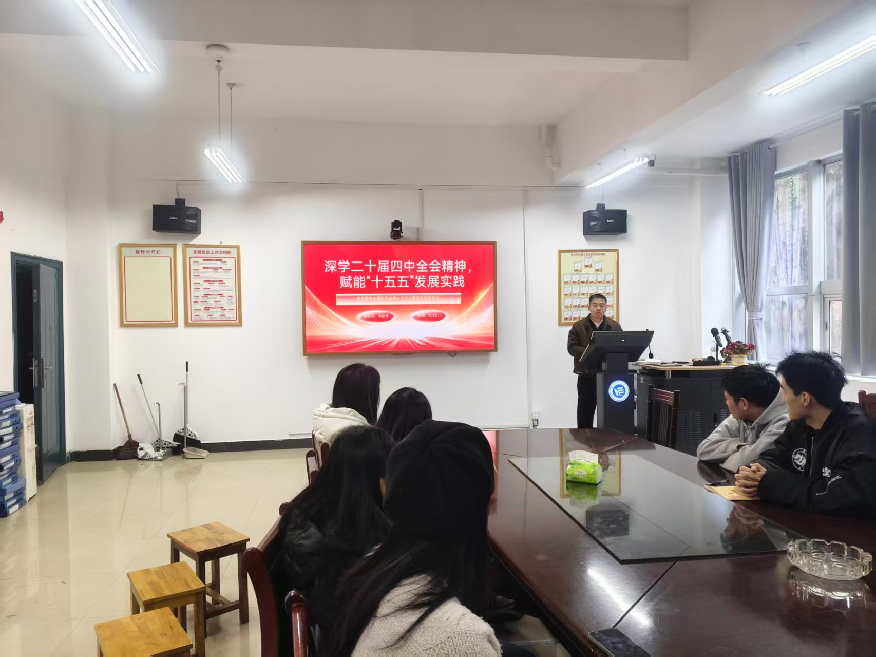 党课环节,谭浩博围绕“深入解读党的二十届四中全会精神”主题,结合国家发展战略与支部工作实际,从全会召开的时代背景、核心要义和实践要求三个维度开展专题党课。随后,全体党员集中观看中共中央新闻发布会关于党的二十届四中全会精神的解读视频,并学习中央层面整治形式主义为基层减负专项工作机制办公室、中央纪委办公厅公开通报的2起整治形式主义为基层减负典型问题,通过正面引领深化认知、反面警示筑牢防线。