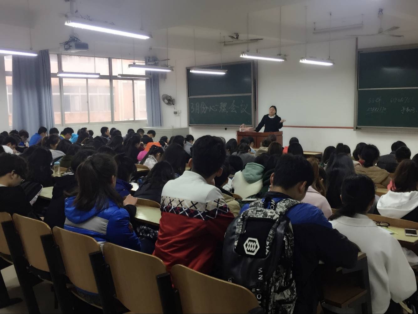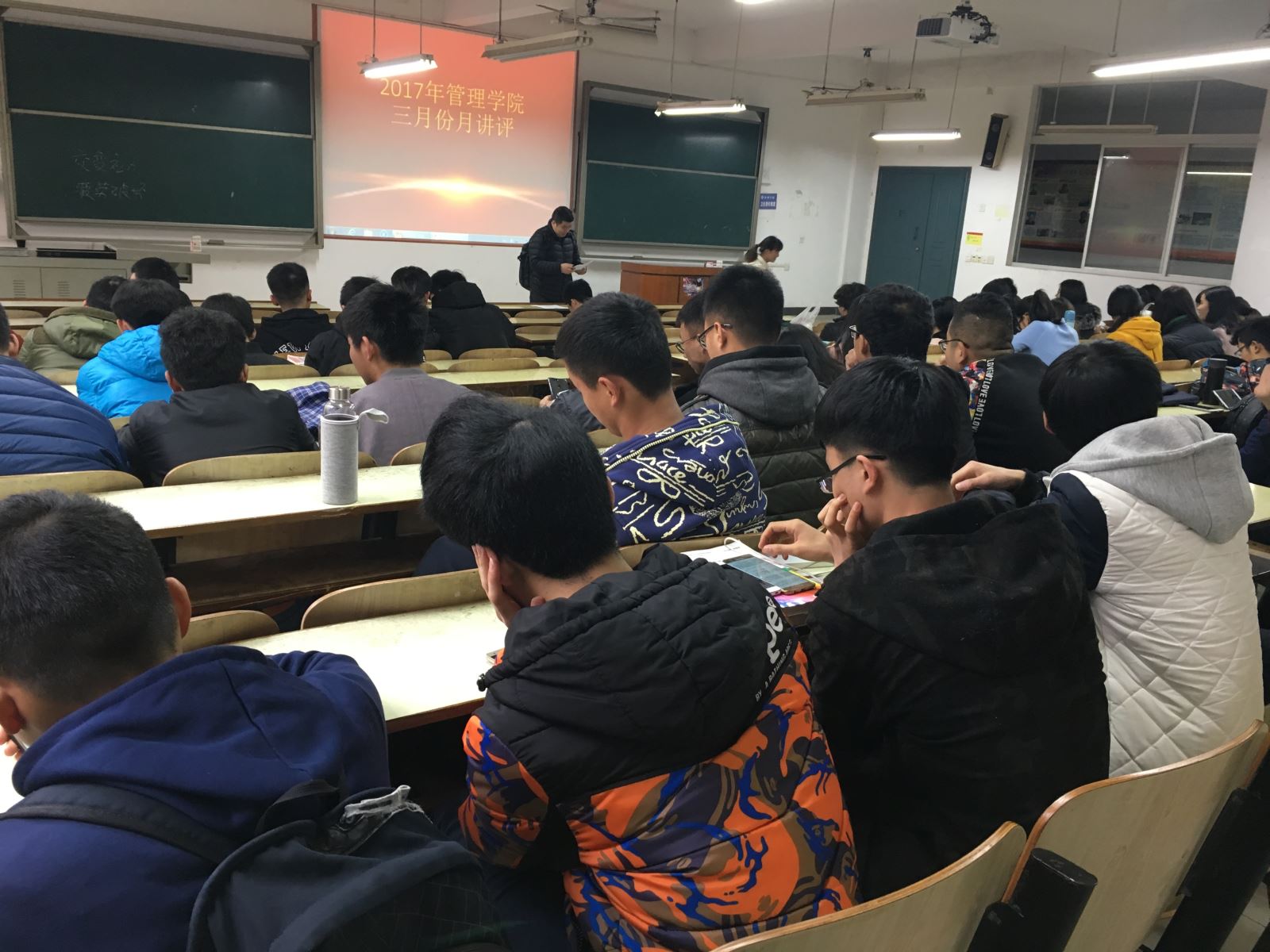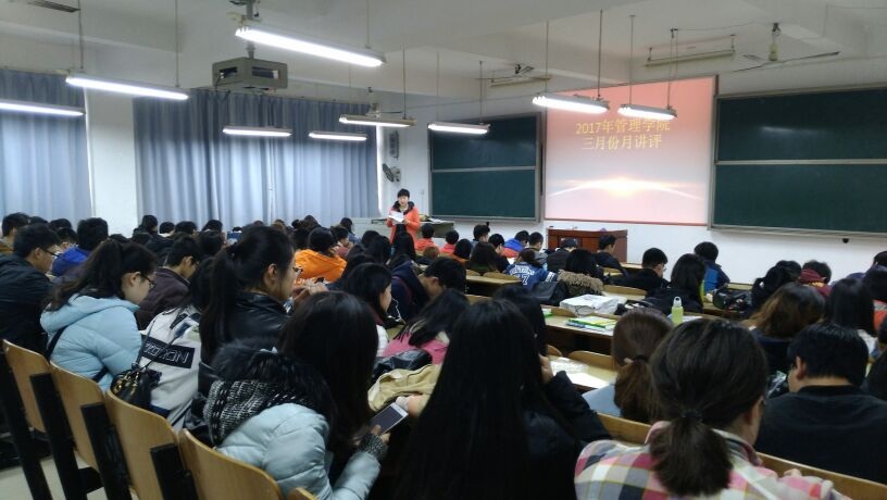 2017年3月13日中午12:20,管理学院工商管理、会计学单学号、物流管理、资源人力、旅游管理全体人员,在主校区教室内进行本学年第一次月评会议。学办辅导老师罗荃、黎博、包海燕、周艺、宋志航对工商管理、旅游管理、人力资源管理、会计学、物流管理六个,专业展开本月讲评。本次会议还有一道靓丽风景,由单艳艳老师召开心理专项会议。心理会议由大一全体心理委员、心理朋辈辅导员、寝室长,以及心理部部干事到会。