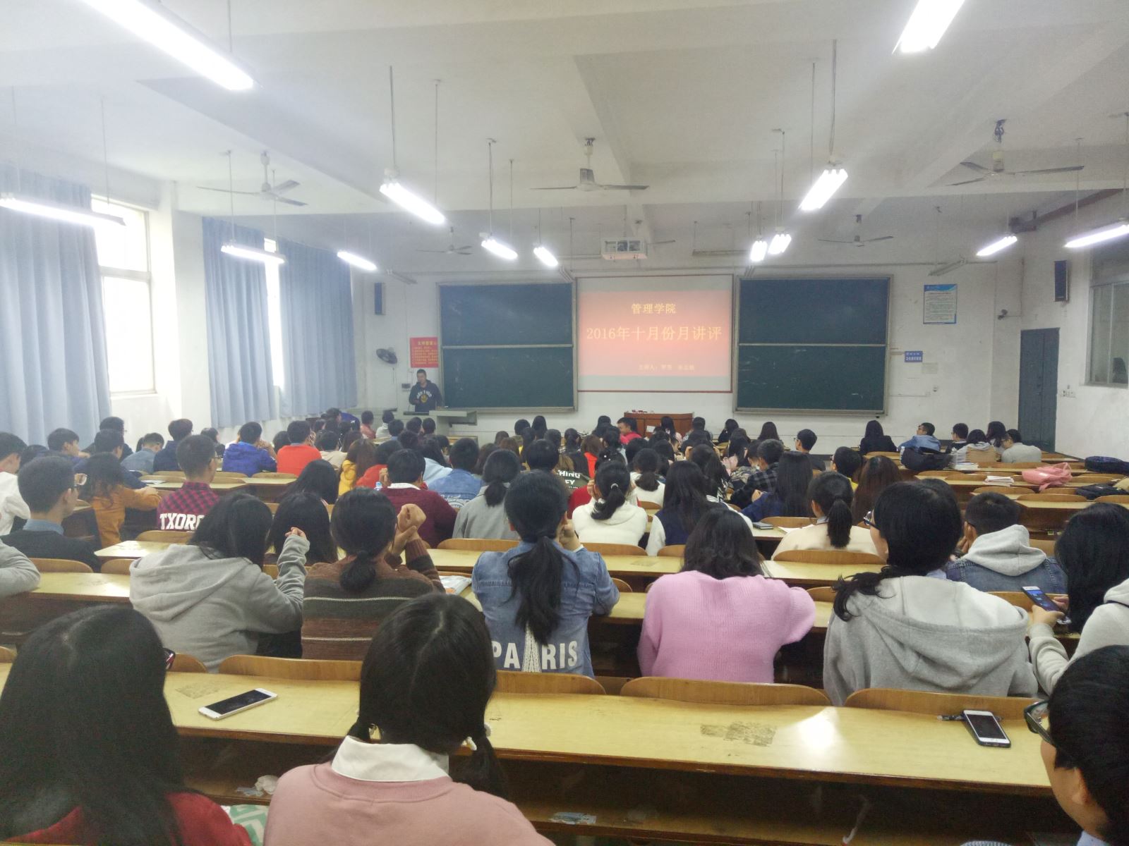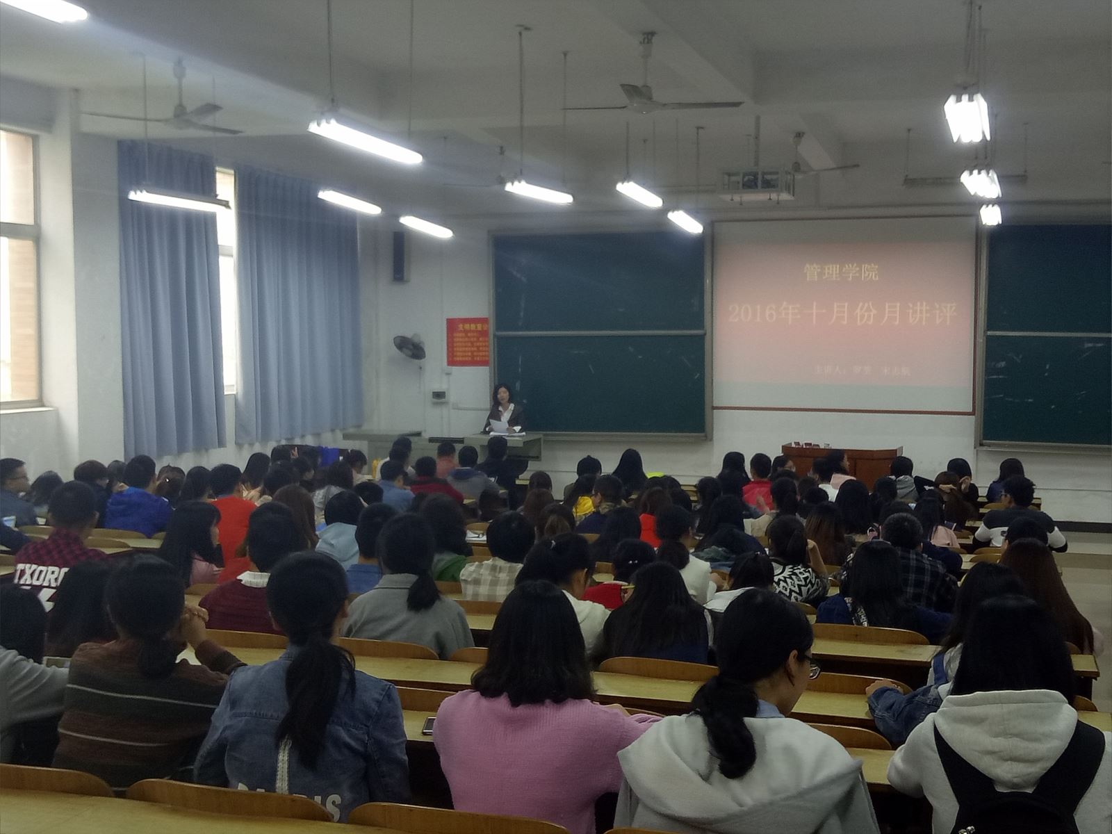 2016年10月27日中午12:30管理学院各班班长、学习委员、团支书、主席团、部长团等在主校区D101教室进本次月评会议。管理学院党总支书记钱祖煜主持,学办辅导老师罗荃、宋志航主讲本月讲评。