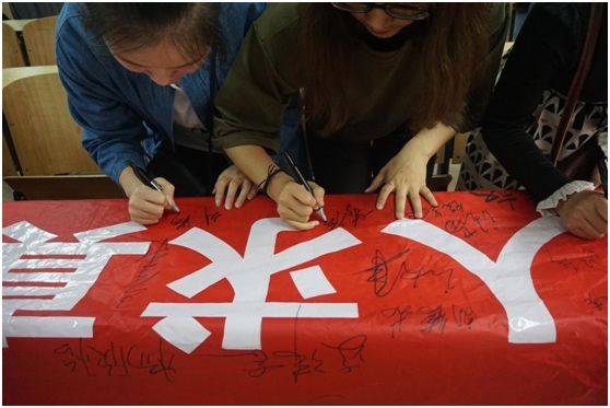 会议最后辅导老师组织全体学生开展了“文明考风,诚信考试”签名活动,旨在响应学校关于教育大学生“助学筑梦,诚信成才”的思想,提高人才培养质量和大学生诚信道德意识。签名形式由各专业分管辅导员老师现场组织,各专业轮流在标有“千教万教教人求真,千学万学学做真人”的横幅上签字。签字完成后,各位辅导员老师强调了诚信考试的重要性,介绍学校关于《太阳成考试管理规定》、《湖南工以及对到学院学生违纪程处分条例》有关考试舞弊处的条款。