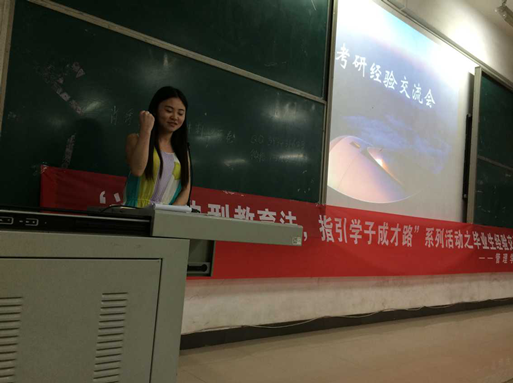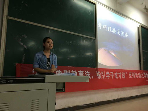 “运用典型教育法,指引学子成才路”系列活动之毕业经验交流会于6月3日晚在新校区D101拉开序幕。本次交流会特邀我院学办主任罗荃老师出席, 2015届考上研究生的学姐们为在校学子们带来了一场别开生面的交流会。
