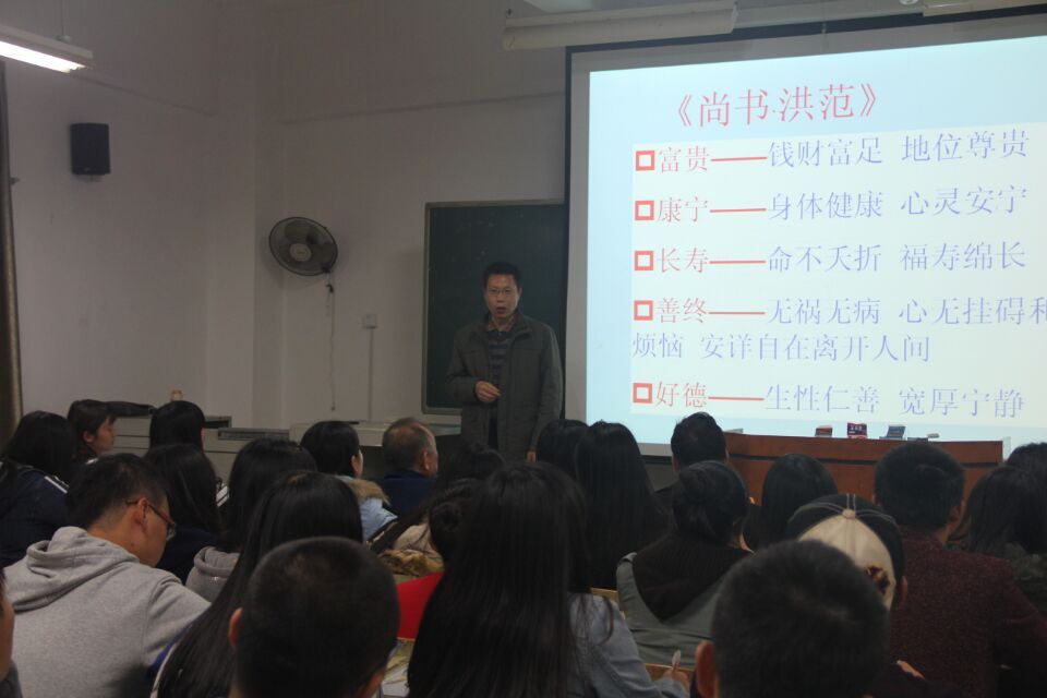 11月8日晚7点,管理学院旅游管理2015级“传统文化进班级”系列活动在教学楼B402正式开班,旅游管理教研室米振华老师开授第一讲《你为什么上大学》。讲座邀请到学生办公室主任罗荃老师、岳塘区法院法官刘志钢和湘潭市传统文化研究会会员张万福老人等热爱传统文化的长辈前来聆听。