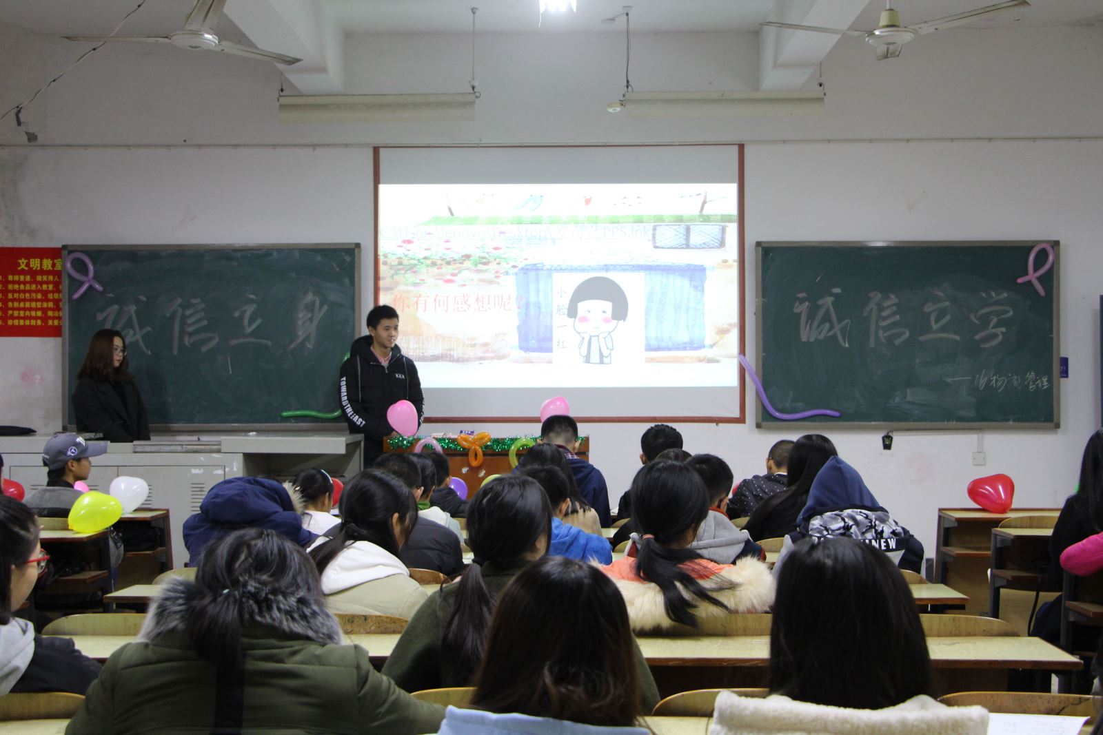 阳光正好,太阳成学院管理学院各专业班级于2017年11月28日晚上7点举办了主题为“诚信立身,诚信立学”的班会,班会主要由班委负责,全体同学参加。