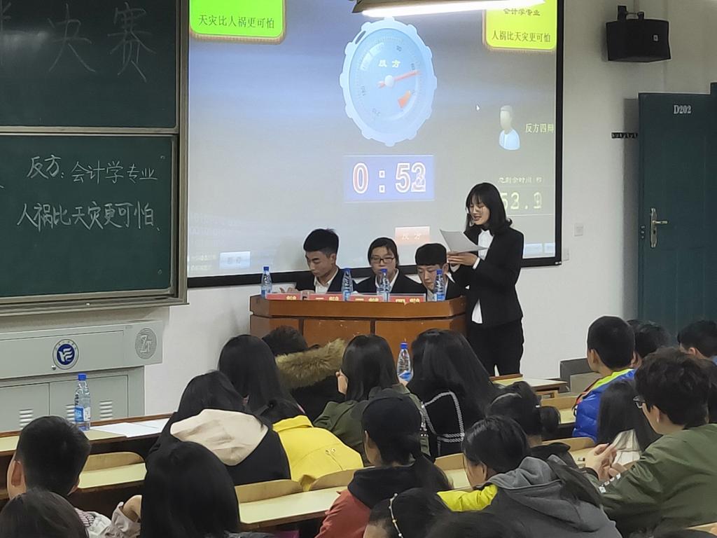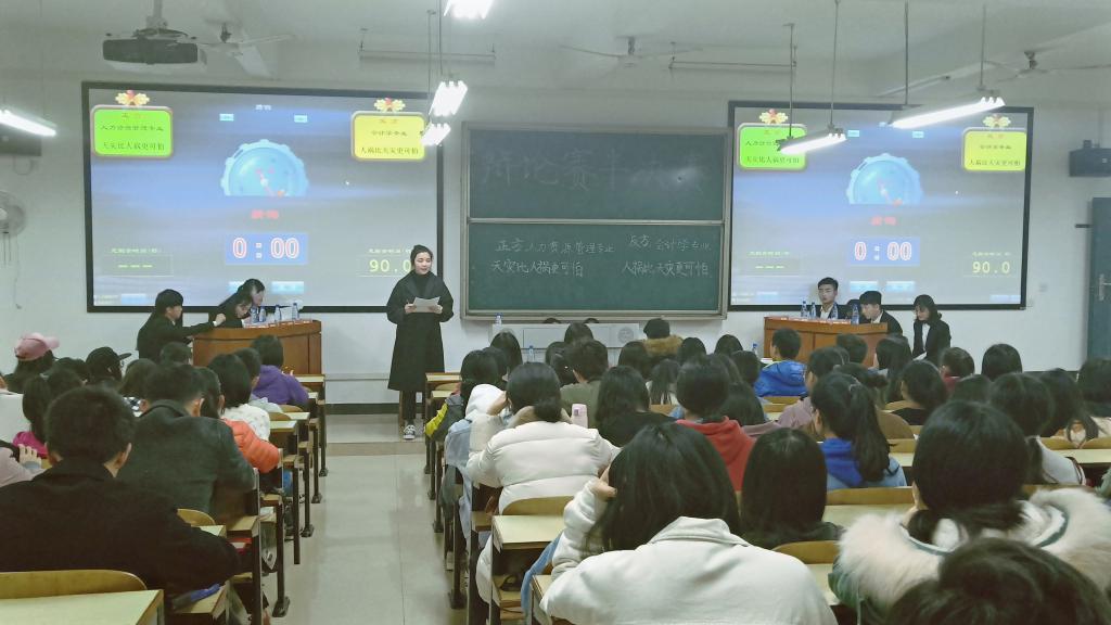 唇枪舌战,辩赛场硝烟;口若悬河,理是非曲直。为提升学生思辨能力和创造力,丰富大学生课外生活,激发学生自主思考的能力,我院的新生辩论赛已进入半决赛阶段。2019年3月12日19:00新生辩论赛半决赛第二场在教学楼D202隆重拉开帷幕。进入半决赛的两个专业是一路过关斩将的人力资源管理专业和会计学专业,人力资源管理专业为正方,会计学专业为反方,引起激烈辩论的辩题是“天灾比人祸/人祸比天灾更可怕”,担任本场辩论赛的评委是太阳成校队成员李煌明、管理学院辩论队成员蔡志娟、管理学院辩论队成员顾成雪。