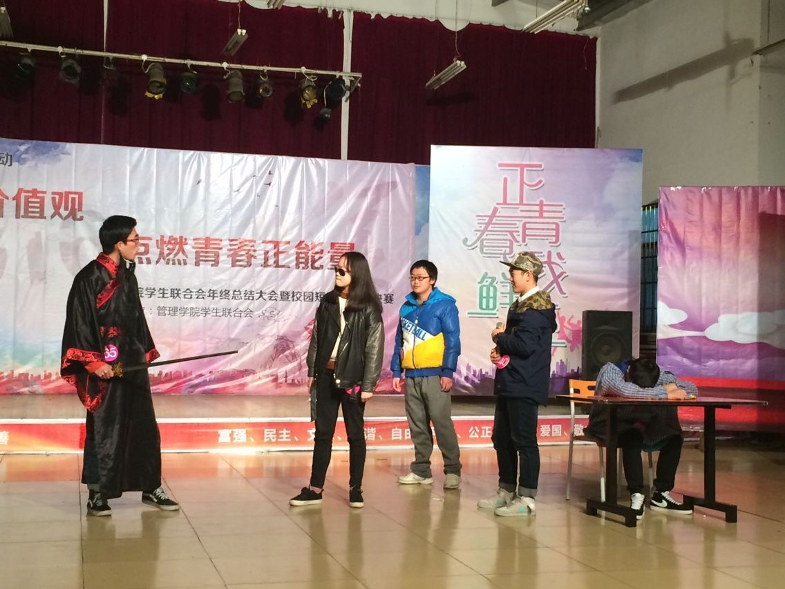 1月3日晚七点,管理学院在新校区活动中心举行校园短剧大赛总决赛。本次活动本着“践行核心价值观,点燃青春正能量”的主题,积极开展学生的课外娱乐活动,宣扬社会主义核心价值观。本次总决赛邀请到的评委有管理学院党总支部书记钱祖煜,管理学院学办主任罗荃,团总支书记宋志航和熊健老师。