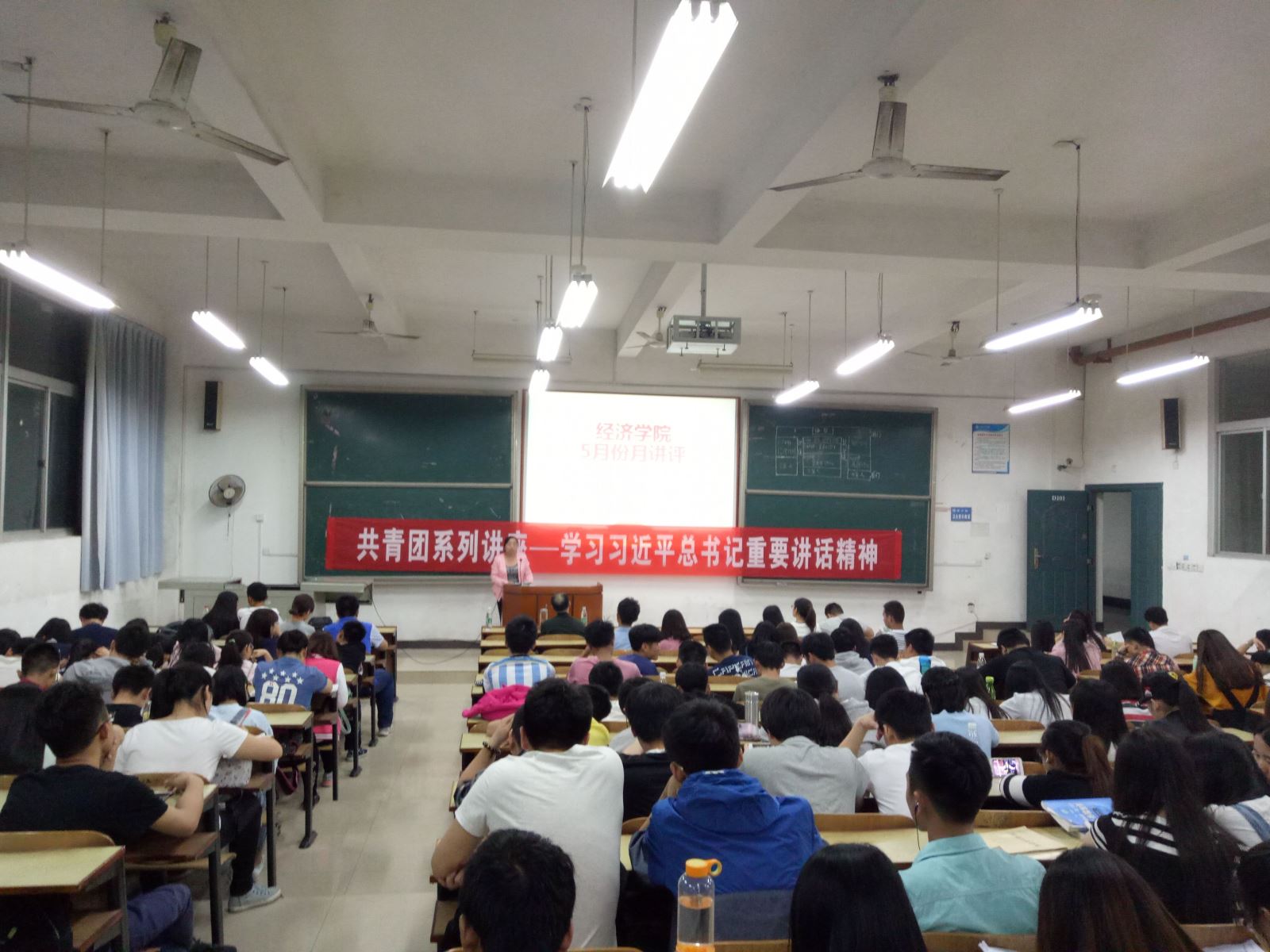 为加强青年学生思想政治引领和价值引领,5月16日晚上7:30,经济学院五月月讲评暨共青团系列讲座之“学习习近平总书记重要讲话精神”活动于D101召开。活动由李倩雯主持,经济学院党总支书记李轶敏和学办主任李军花担当主讲人,经济学院团学会成员及全体大一同学共同参加。