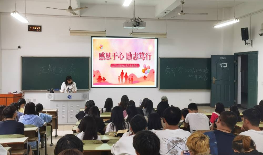 此次主题班会分为两个部分,第一部分为励志教育,班主任或辅导员分享受资助学生的励志故事,让广大学生看到自立自强、励志成才的先进典型,培养励志精神;第二部分为感恩教育,从国家、家庭、学校和社会等方面阐释感恩的意义并教导学生如何感恩,培养学生的感恩意识,增强学生的社会责任感。