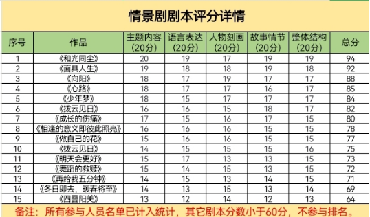 本次大赛共收到学生参赛作品共计50余篇,组委会评委依据评分细则对剧本进行评定,根据主题内容、语言表达、人物刻画、故事情节和整体结构等方面进行综合评分,经过初审、复审,最终评定出心理情景剧优秀剧本。