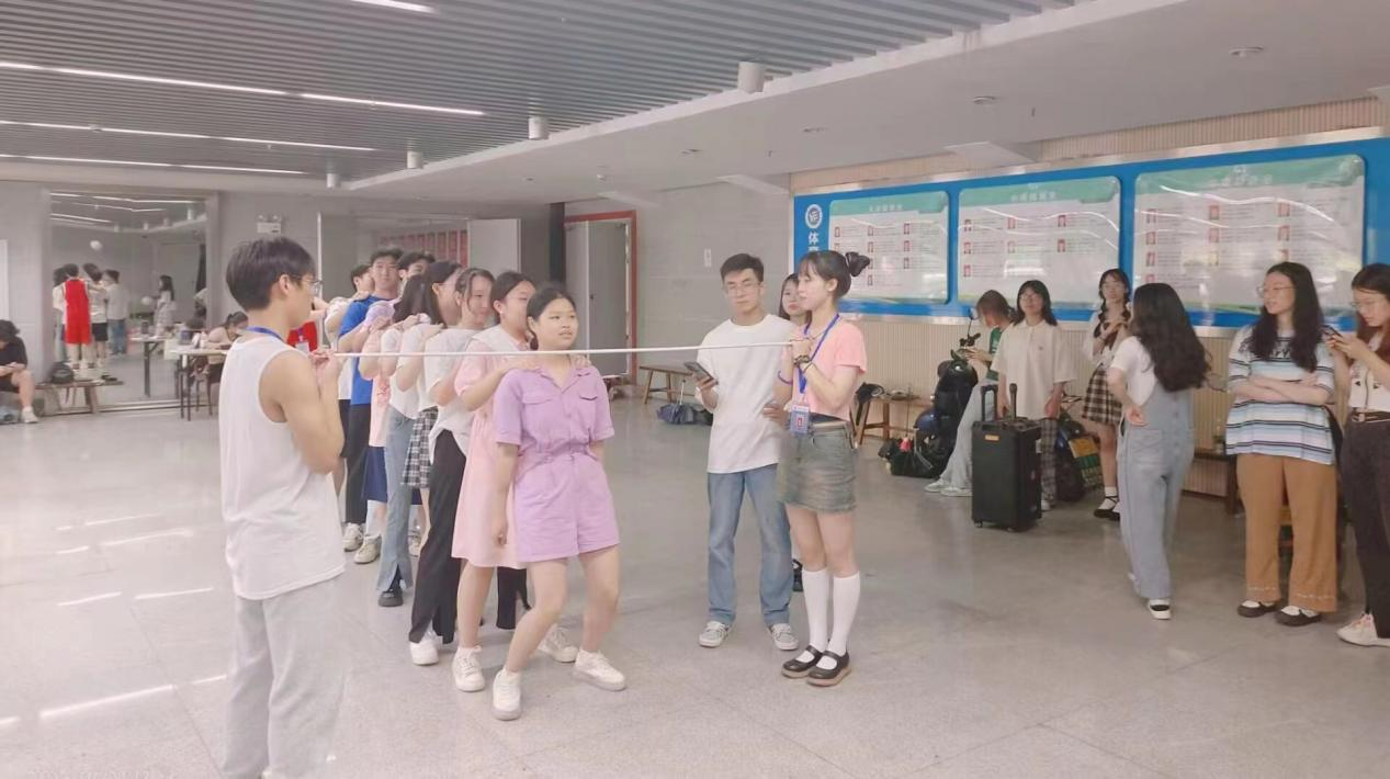 然后到了“低空飞行”游戏,心理部干事手拿杆子限制高度,小组成员需用手搭在前面同学的肩膀上共同通过杆子,每个小组有三次机会,取最好成绩。同学们相互配合,齐心协力,尽自己所能快速通过关卡。其中难免有断开或撞杆的情况,但同学们仍不放弃,出色的完成游戏。