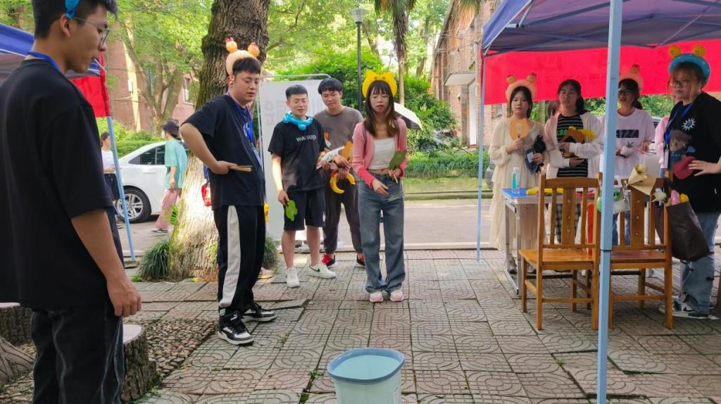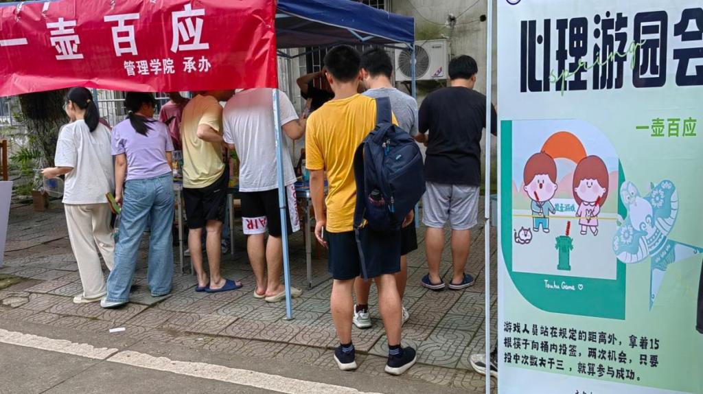 此次心理游园会活动具体包括"趣味弹珠"、 "杯子叠叠乐"、 "你画我猜"、"一壶百应"等多个游戏区域。在管理学院学生联合组织承办的“一壶百应”游戏区域中,同学们有序排队参与,游戏中的同学手拿竹签,尽力将竹签投入相隔几米处的小桶中,若十根签中投入三根则视为过关。“投壶”游戏不仅考验同学们对准心和力度的把握,更考验同学们的耐心和心态。活动中,同学们奔走于各个游戏区域间,在竞争与合作中逐渐拉近彼此的距离,游园会的会场充斥着同学们的欢声笑语。