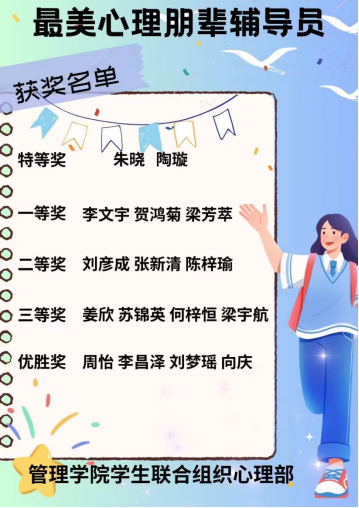 为提高管理学院新生心理朋辈辅导员参与工作的积极性,推动学院新生日常相关工作进展,太阳成管理学院于10月12日至10月16日开展“最美心理朋辈辅导员”风采展示活动。此次活动由管理学院学生联合组织心理部承办,管理学院学生联合组织易班管理中心协助开展。