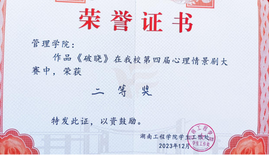 图三:管理学院《破晓》心理情景剧大赛荣誉证书