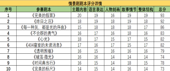经评委组严格依据评分标准,从主题立意、文本结构、语言表现力、人物塑造及情节设计五个维度进行综合评审,最终评选出特等奖一名、一等奖两名、二等奖三名、三等奖四名,共计十部优秀剧本脱颖而出。