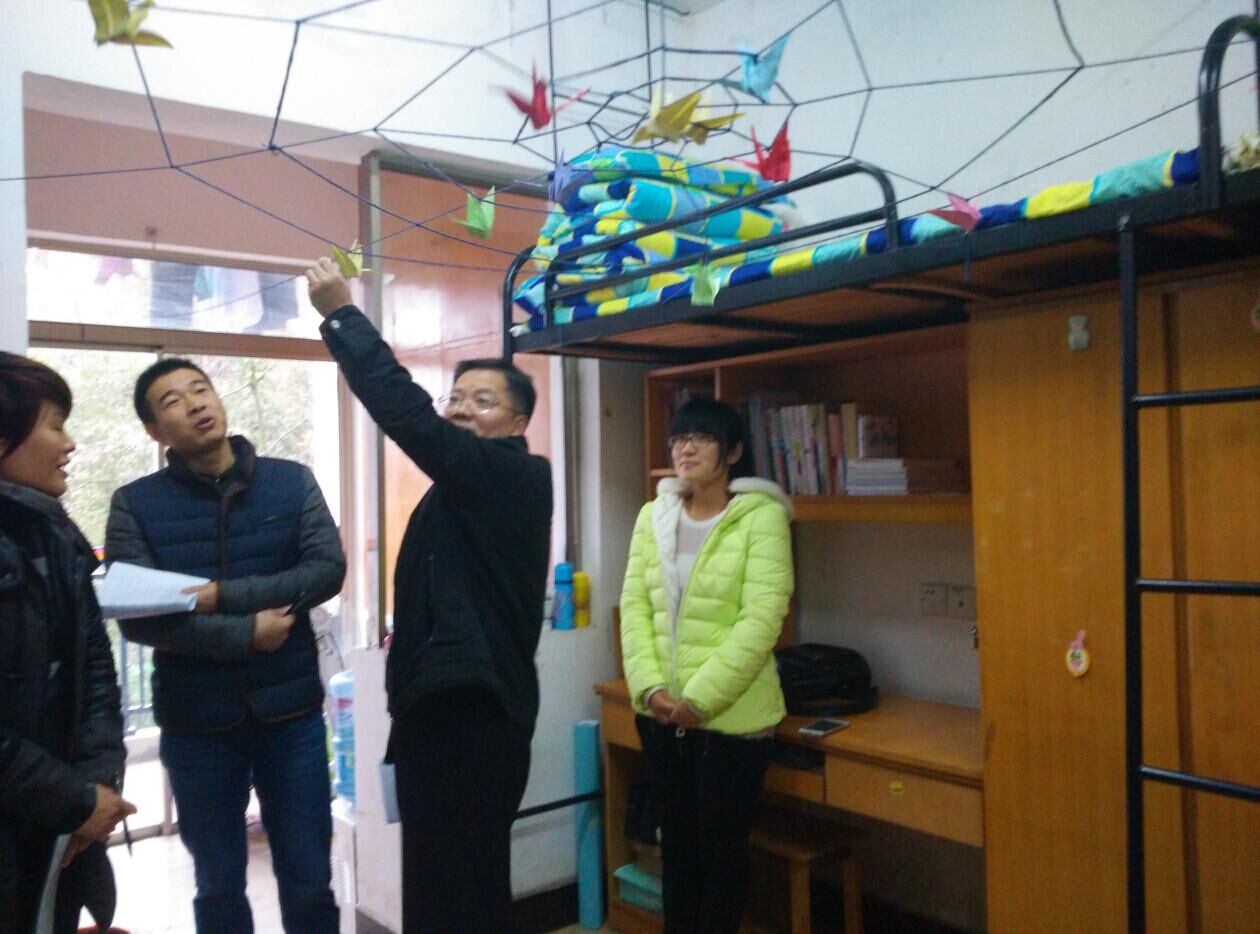 评委们每走访到每一间寝室,寝室成员都自豪地介绍自己寝室的设计理念,也得到老师们纷纷点赞。“我们打着台灯贴壁纸弄到了凌晨两点呀!”同学们介绍道。为了将自己的寝室装扮成一个靓丽、温馨的家,室友们都付出了努力。