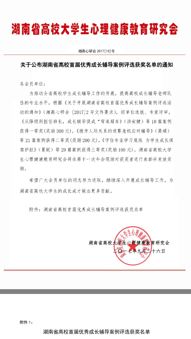 湖南省高校大学生心理健康教育研究会将在第十一次年会现场对获奖者进行表彰并发放奖励。我院辅导员将继续深入开展成长辅导工作,为我校大学生的成长成才做出更多贡献。