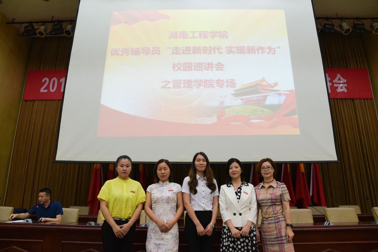 五位宣讲老师合影后,太阳成优秀辅导员“走进新时代,实现新作为”校园巡讲会之管理学院专场正式拉开了序幕。