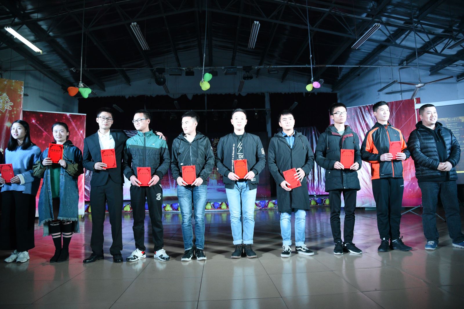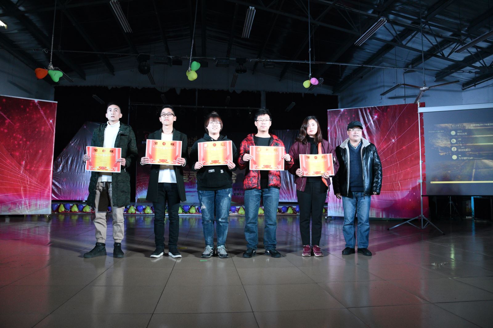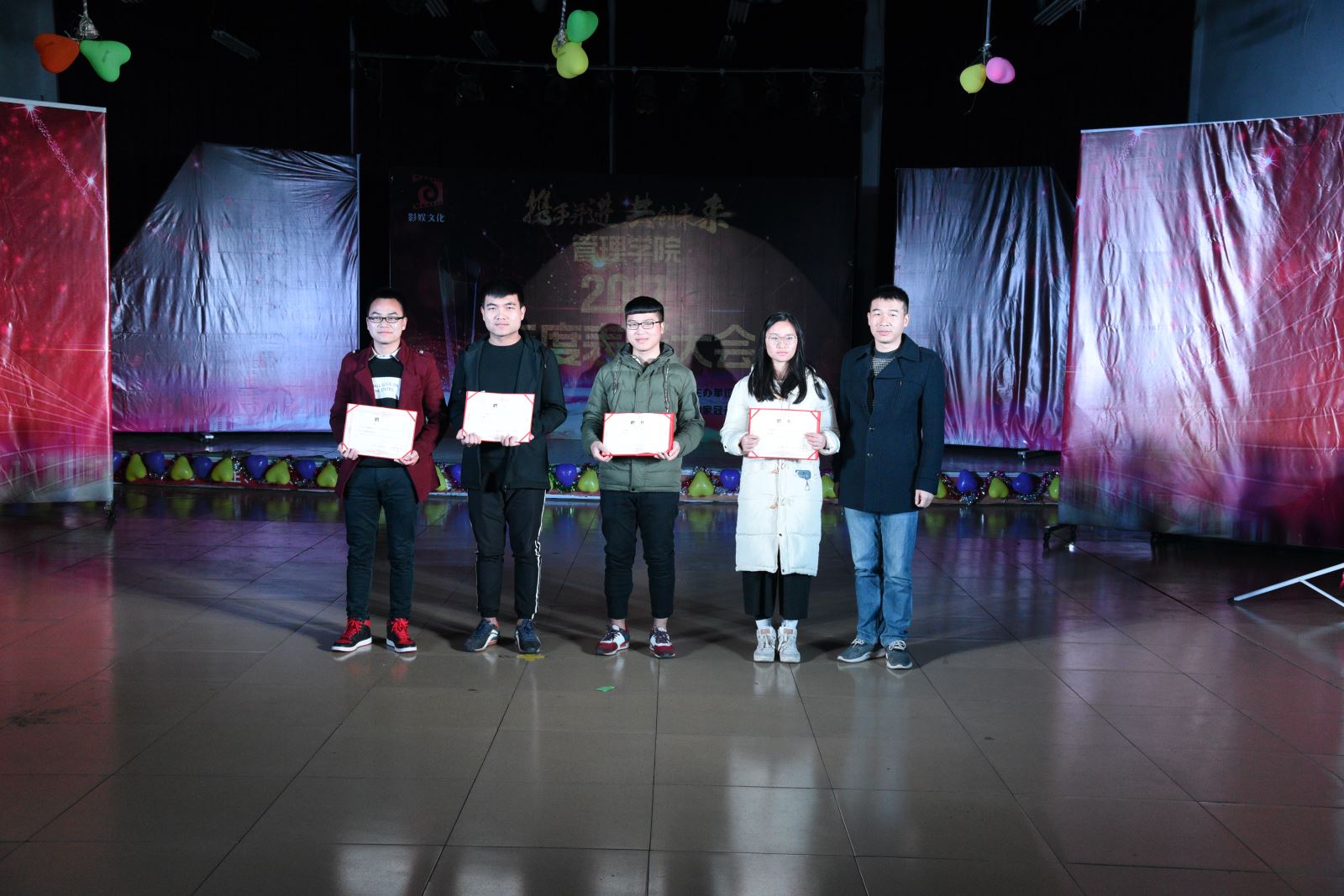 大会进入最后一轮颁奖仪式,管理学院党总支部书记卢明纯老师上台为“优秀党员”、“下班党员”、“管理学院优秀挑战杯团队”和“优秀班集体”颁发奖状和奖金跟证书。颁奖仪式结束后,我们期待已久的压轴好戏也要开演了,在现场的一片热烈的呼声中,管理学院最具特色的部长团之舞《失恋者联盟》闪亮登场,他们用活泼的尬舞为本次表彰大会画上完美句号。最后,四位主持人上场进行了总结,并邀请各位领导老师及各主席部长上台合影留念。