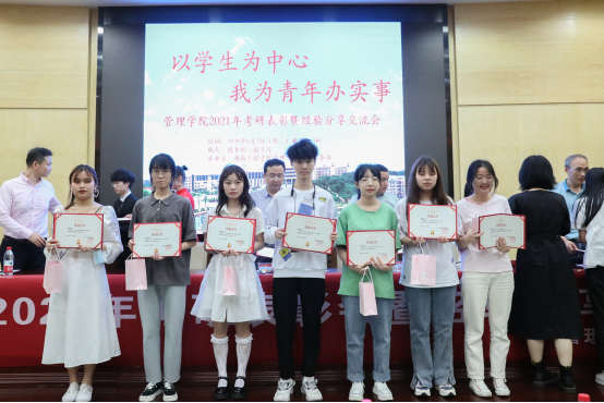 为树立典型,表彰先进,6月2日晚,管理学院在二报告厅召开2021年考研表彰暨经验分享交流会。副校长陈赤平,学院领导班子,优秀校友代表罗小青出席并为受表彰的个人颁奖。会议由学院党委副书记张宏主持。