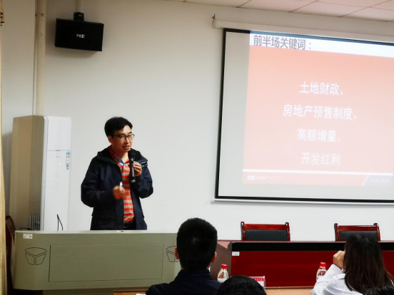 李伟国指出,中国房地产产业对GDP的直接影响作用超过10%,前20年的高速发展可用土地财政、房地产预售制度、高额增量、开发红利等四个关键词概括,但随着国家加强对房地产产业的宏观调控,中国房地产行业必须转型升级,要围绕做活市场存量、聚焦大都市圈化、做实服务红利、提升产品质量四方面做文章。他还全面介绍了公司目前正的研发的大平层产品项目,从地产项目设计的地段论、空间论、装备论与服务论等四个维度全面阐述了该产品的设计理念与营销策略。报告会气氛活跃,期间李伟国董事长还与同学们进行了亲切的交流,师生们均表示受益匪浅。