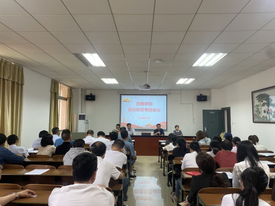 2022年4月12日,管理学院院党委书记余博同志组织学院全体教职工在G505开展意识形态专题会议。