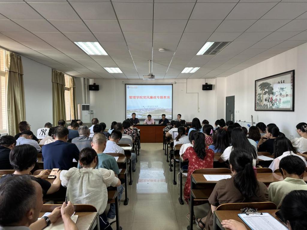 2023年9月19日下午,管理学院全体教师在G505参加党风廉政专题教育,会议由余博书记主持。