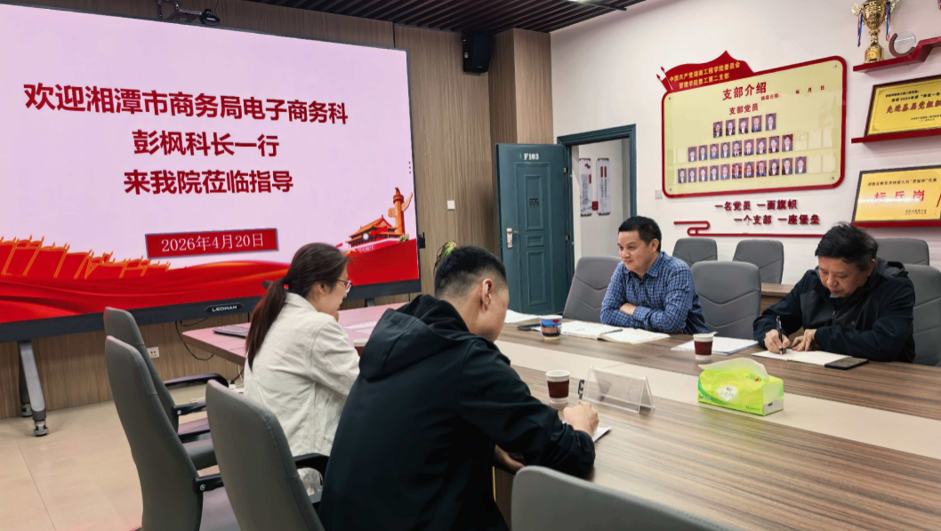 为进一步整合政校企资源,推动湘潭市跨境电商高质量发展,4月20日,湘潭市商务局电子商务科科长彭枫、副科长伍剑波一行赴ok138cn太阳集团529,专题调研湘潭市跨境电子商务协会筹建工作。ok138cn太阳集团党委书记徐运保,特邀专家胡俊达,电子商务专业教研室主任李立及教师代表参加座谈。