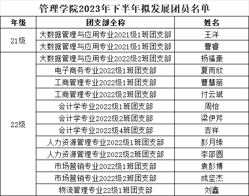 据校团委相关文件及通知精神,参照《中国共产主义青年团发展团员工作细则》,经个人申报,班级团支部推荐,学院团总支评审,拟推荐王洋等14名同学为2023年下半年发展团员报至校团委审核。具体名单公示如下。