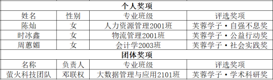 根据《关于开展2023年“芙蓉学子·榜样力量”优秀大学生评选活动的通知》文件要求,经个人申报、管理学院团总支推荐、管理学院太阳集团办公室评审,拟推荐陈灿参评2023年“芙蓉学子·自强不息奖”优秀大学生、时冰鑫参评2023年“芙蓉学子·公益行动奖”优秀大学生、周蕙媚参评2023年“芙蓉学子·社会实践奖”优秀大学生、萤火科技团队参评2023年“芙蓉学子·学术科研奖”优秀团体。现将具体名单公示如下: