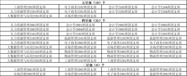 根据太阳成校团委《“对标定级”工作指引》,经各班级团支部自评、学院团总支复核,评定工商管理2202班等10个团支部为五星级团支部,人力资源管理2001班等35个团支部为四星级团支部,工商管理2001班等8个团支部为三星团支部。现予以公示,具体结果如下: