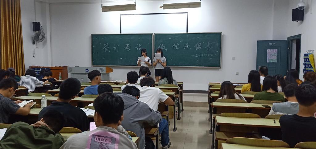 当天,在各班班干的组织下,我院全体班级自行召开班会,由各班宣读人带领同学们宣读《诚信考试承诺书》。《承诺书》中明确要求:1、考生自觉遵守国家、学校关于考试的相关政策和规定;2、不得带任何与考试内容相关的材料以及电子通讯设备进入考场;3、考试过程中不得交头接耳、不偷看、抄袭他人试卷。对违反承诺造成的后果,由考生承担相关责任。随后,同学们按要求在《承诺书》上签名,并表示会严格遵守考场要求,维持考场纪律。